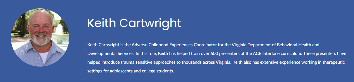 Keith Cartwright is the Adverse Childhood Experiences Coordinator for the Virginia Department of Behavioral Health and Developmental Services. In this role, Keith has helped train over 600 presenters of the ACE Interface curriculum. These presenters have helped introduce trauma sensitive approaches to thousands across Virginia. Keith also has extensive experience working in therapeutic settings for adolescents and college students.